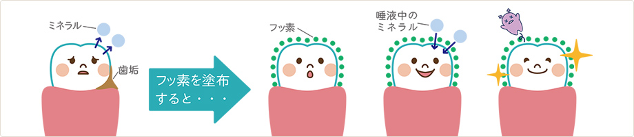 フッ素を塗ることで歯質が強化され、唾液中のカルシウムやリン酸を効率よく取り込み、歯を修復する再石灰化を促します。また、歯に溜まった汚れにもフッ素が浸透して、むし歯菌の働きを抑えるため、定期的に塗布することで高い予防効果が期待できます。
