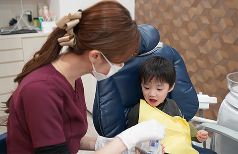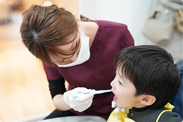 歯ブラシの持ち方、磨き方、歯に当てる角度など…小さなお子様の場合は保護者の方に、ご自身で磨くことのできる年齢のお子様にはご本人に直接お伝えします。