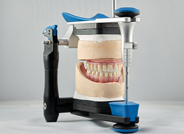 入れ歯を長く快適にお使いいただくためには、”精密な設計”が不可欠です。当院では、「フェイスボウ」という器具を使って患者様の顎の位置を正確に測り、そのデータを「咬合器」という模型に取り込みます。こうして、患者様の顎の動きや咬み合わせを三次元で再現することで、お顔やお口の形にぴったりと合う、より精度の高い入れ歯の製作を可能にしています。
