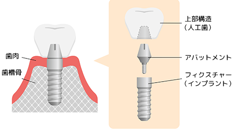 歯槽骨に埋め込むチタン製の人工歯根です。骨との結合(オッセオインテグレーション)を促進する構造を持ち、インプラントの土台となります。