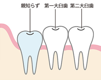 親知らずは、永久歯の中で一番奥に生えてくる「第三大臼歯」のことをいいます。一般的には、10代後半から20代前半に生えますが、生えてこない方もいます。