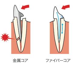 ファイバーコアは、耐久性がある上に硬さや弾性がほぼ歯と同じであるため、歯にやさしく、歯が割れる(歯根破折)リスクも軽減できます。