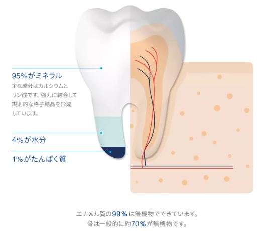 エナメル質の厚さは平均2~3mmと薄いですが、熱いものや冷たいもの、酸性の食品など、歯がシミると感じさせるものが、刺激に敏感な内部の層に触れないよう保護する役割を果たしています。