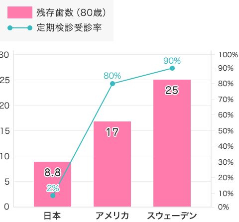 予防歯科で大事な、定期健診を受診している割合が高いスウェーデンやアメリカでは、80歳の時点で残っている歯の本数が日本の約2~3倍になっています。