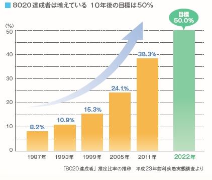 8020達成者は年々増加しており、平成17年の調査では24.1%でしたが、平成23年には38.3%にまで増加しています。