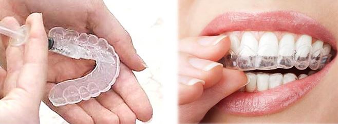 ホームホワイトニングは、専用のマウスピースにホワイトニングジェルを塗布し、マウスピースを装着してホワイトニング剤を浸透させます。