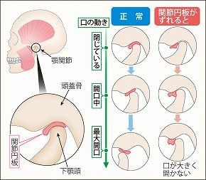 関節円板のズレによって起きる。異音、口が開けにくいなどの症状の他、強い痛みを伴うことも。歯科医院による初期治療(スプリントの作成、自宅で出来る顎のストレッチ、食事や生活上の注意点など)により痛みが軽減することが多いが、痛みが強かったり症状が長引く場合は専門医へ。