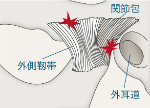 顎関節の周囲のある靭帯などが肉離れや捻挫を起こして痛む。硬い食べ物を避けるなどして大事にしていると、通常は自然に回復する。