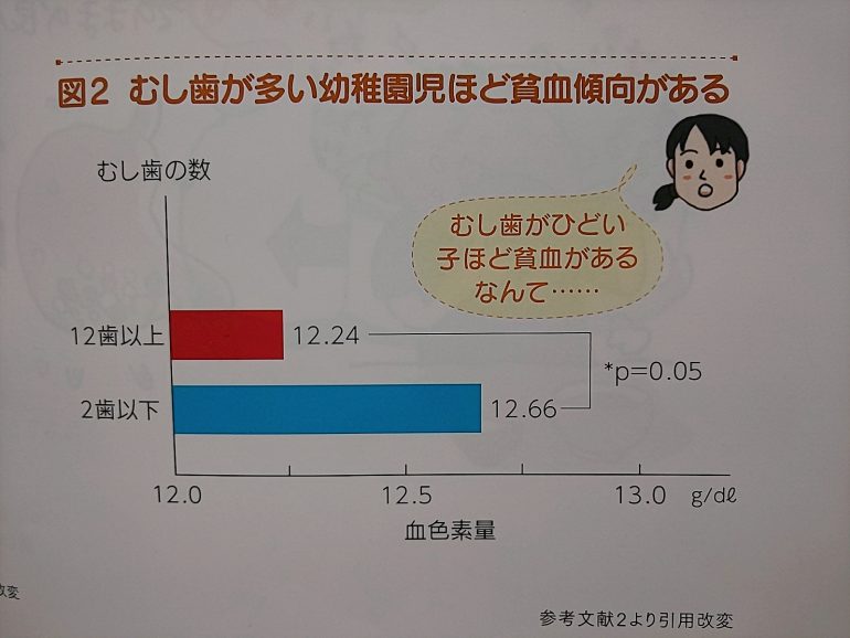 “虫歯が多い3歳児”と“虫歯のない3歳児”の体重を比較した研究があります。虫歯の多い子の平均体重は約15㎏に対し、ない子では17㎏とすでに2㎏の差がついていました。他にも虫歯が多い子ほど貧血傾向があるという研究結果が出ています。