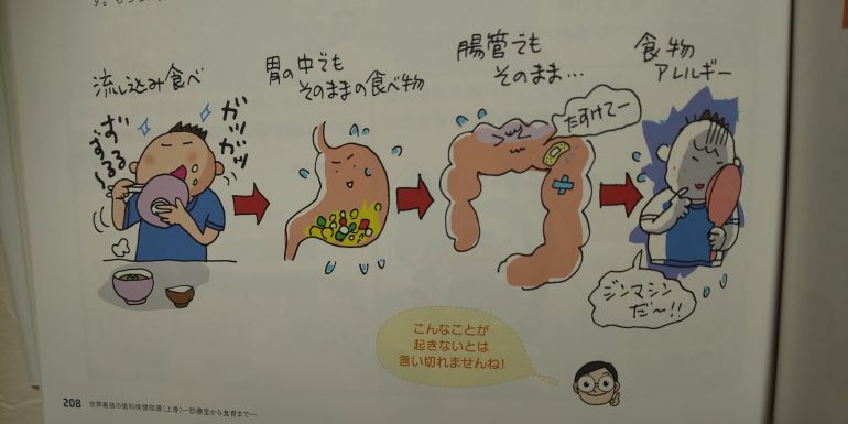 私達の体は食べ物からできています。本来、ヒトにとって異物である食べ物を歯で噛み消化することで体に同化させ消化するのです。食物アレルギーを専門にしている小児科医は、食物アレルギーの一番の予防は“よく噛むこと”と口を揃えて言います。食物アレルギーは、抗原が腸管から侵入することで起こります。もちろん食物アレルギーには、遺伝など様々な要因があります。