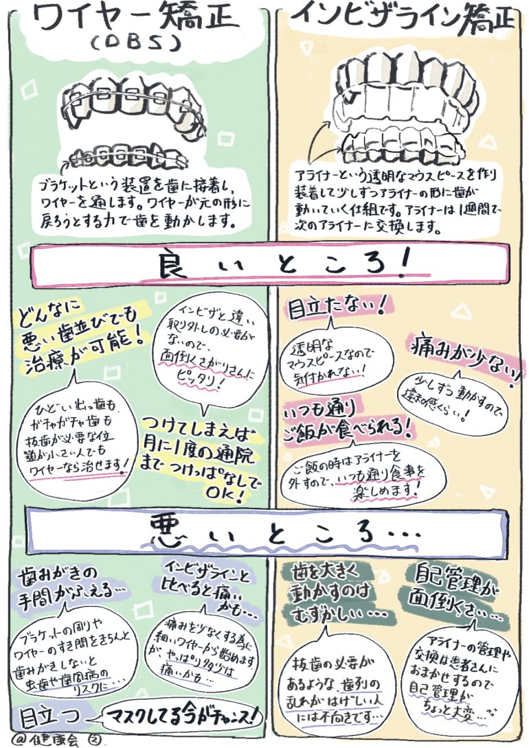 年末の寒くてお忙しい時期、いかがお過ごしでしょうか。 私は毎日こたつに食われて一年を振り返っています。 皆さんはどんな一年でしたか?🐢 新型コロナウイルス、まだまだ終息の気配がありませんね… 皆さんマスクをつけて外出、勉強、お仕事にもう慣れてきた頃かと思います。 実は今、「マスクを常に付けている今だからこそ歯列矯正しよう!」 という方が増えています。 「歯の矯正したいけど周りに矯正していること知られたくない…😔💧」 「接客業なので目立つ矯正はちょっと…😅」 という方、今がチャンスです。 「透明なマウスシールドを使っているので…😫💦」 という方も!目立たない矯正のご紹介も一緒にやっちゃいます! 当院では「ワイヤー矯正」と「インビザライン矯正」 二種類の矯正方法を扱っています。 わかりやすいようにぱぱっと図で説明しちゃいます。もちろんライフスタイルによって向き不向きや 歯を抜かないといけない場合もございますので 一概に「こっちの矯正方法の方がいい!」とは言えません…💦 まずはご来院頂いて、お口の中の状態を検査させて頂き 矯正の専門医から詳しい話を聞いて頂き、それから選んでいただきます。 「でもでも予約が取り辛いってきくし…」とお悩みの方へ 当院は「虫歯も予防も矯正も出来る、通いやすい歯科医院です!」ということを 是非アピールさせて下さい! 例えば他の一般歯科医院さんだと 矯正専門の先生が月に一度しか来なくて 予約が二ヶ月後になっちゃう…という所もありますし 矯正専門の歯科医院さんだと 矯正するための抜歯や、虫歯の治療、歯石を取るのは 他の医院へ紹介状を書いて行っていただく、 という所も少なくありません。 当院は院長が矯正の専門医なので ひまわり歯科、よつば歯科含め週に5日矯正の患者さんを受け入れており 更にひまわり歯科では第3火曜と土曜、 よつば歯科では月に一回日曜日に別の矯正の専門医が診療しているので 「今すぐ矯正を始めたい!」という方は、 ご希望の曜日や時間帯にもよりますが 少なくとも一ヶ月以内にご予約をお取りできます。 更に矯正の抜歯や、虫歯の治療、歯のお掃除なども 当院で行うことができますので 色んな歯科医院を行ったり来たりする必要もありません。