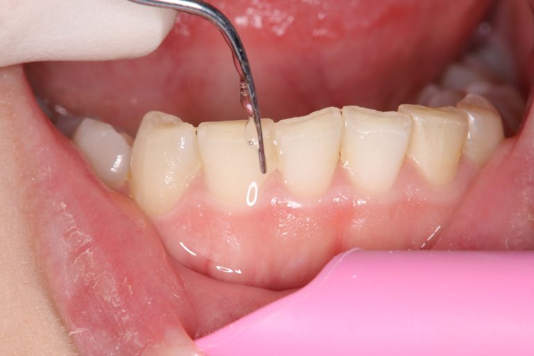 視診での虫歯のチェックと、歯周ポケット(歯茎のまわり)の深さを専門の器具を使って検査して歯茎の状態を診ていきます。