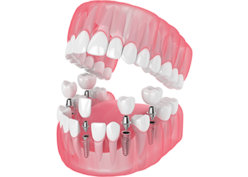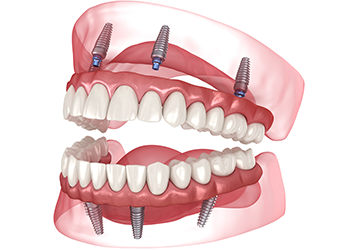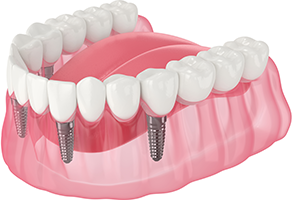 総入れ歯の方や残存歯が少ない方に適した治療方法です。4本(症例によっては6本)のインプラントで最大12本の人工歯を支えることができ、治療本数を抑えることで手術や経済的な負担を軽減できます。通常のインプラントと同様の使用感で、しっかりと咬むことが可能です。あごの骨が痩せている場合でも、手術が行えるケースがあります。