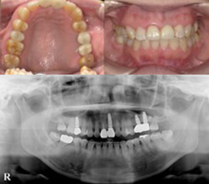 奥歯は欠損放置による骨量不足のため骨増生を行い、前歯は破折歯をジルコニアセラミックとインプラントで補綴しました。前歯4本はオールセラミックにて修復しています。