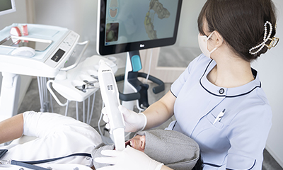 人工歯を作製するために、お口の型取りを行います。当院では粘土のような印象剤を使用した型取りではなく、ペン型の口腔内スキャナー「iTero」で型取りを行っています。