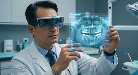 AR(拡張現実)とは、現実の映像にデジタル情報を重ね合わせて表示する技術のことです。ゴーグルやモニターを通じて、CT画像やお口のスキャンデータ、治療計画を実際の手術視野に映し出しながら確認できるため、インプラントを埋め込む位置や角度をより精確に把握することができます。